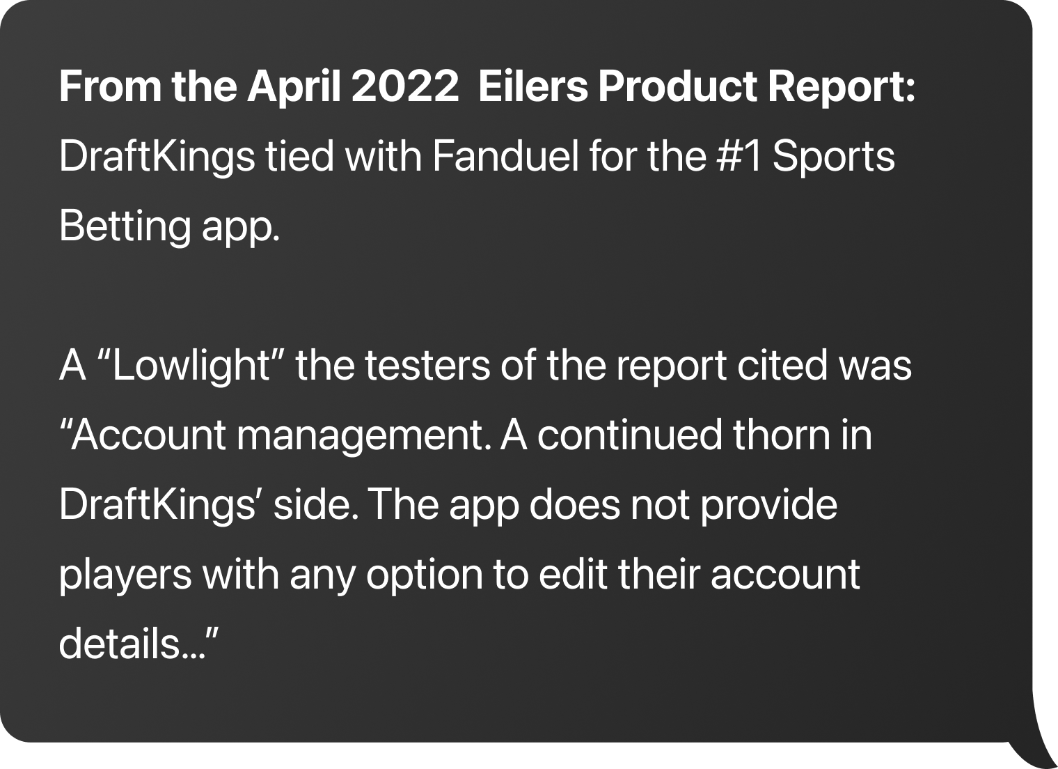 To sell the idea of a unified account system across all of DraftKings products, I needed to look into our quantitative and qualitative data sources to begin shaping the core problems. I wish there was one clear smoking gun of a data point that could point to this new experience as the solution, but instead, I needed to tap into different resources to identify the problems.
